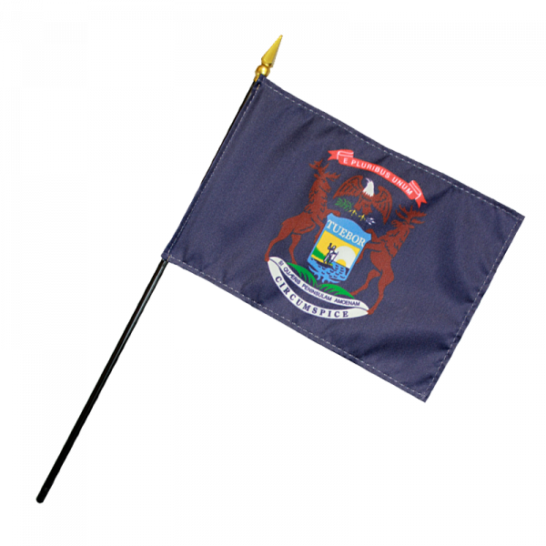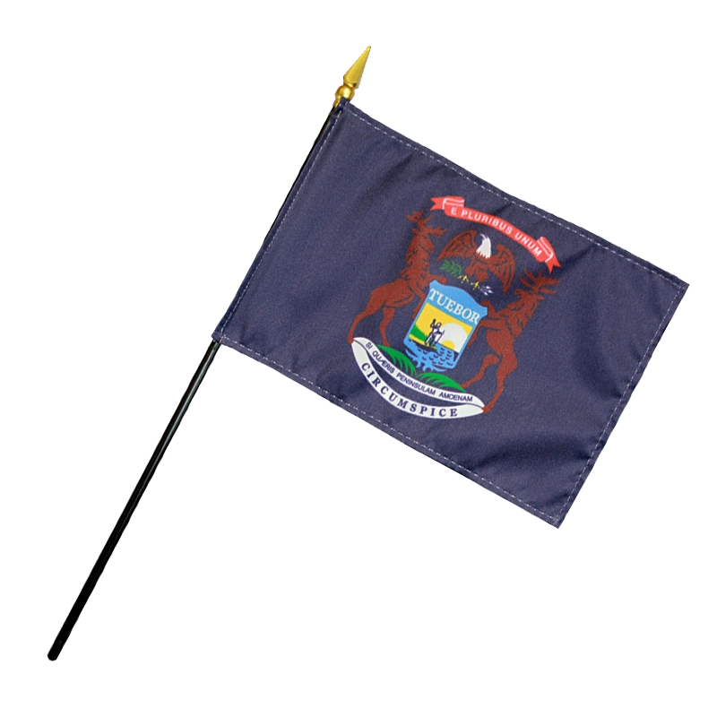 The flag of Michigan has a dark blue background with the state’s coat of arms.