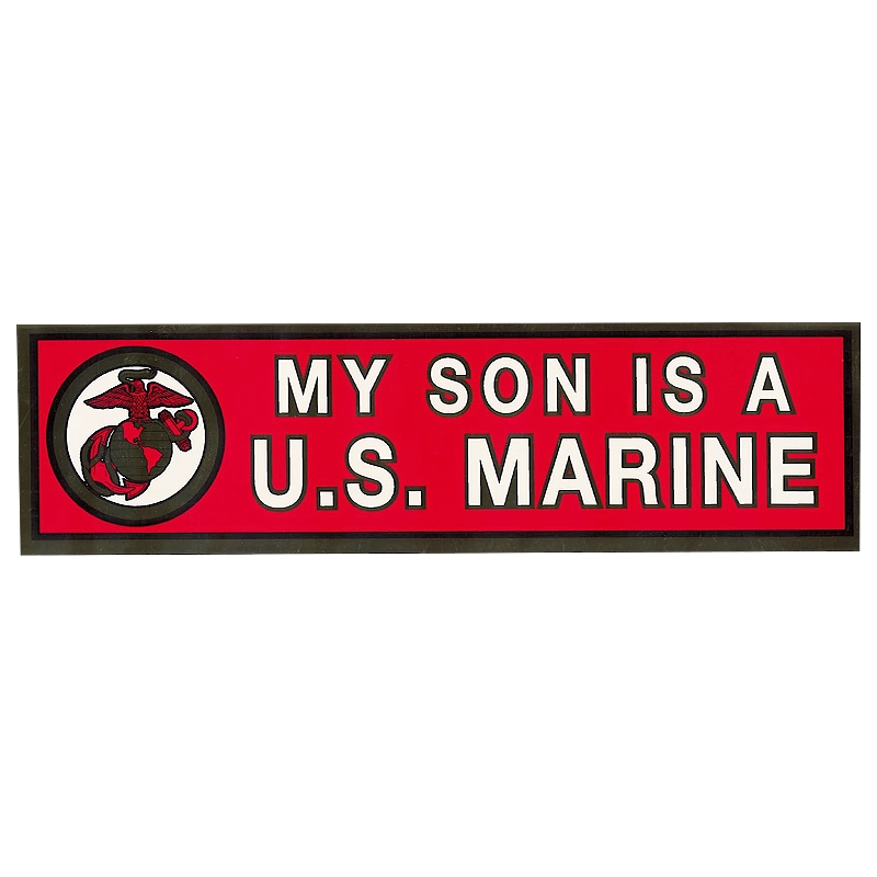 This shiny bumper sticker is sure to attract attention! “My Son is a U.S. Marine” in white lettering and outlined in shiny gold stands out from bright red background.
