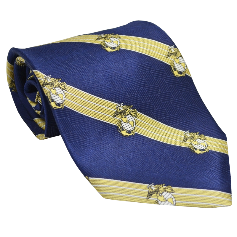 Silk tie has gold and white diagonal stripes with two-tone Eagle, Globe and Anchors against a navy blue background. Wear it to any informal or formal event since it matches most shirt or suit color.