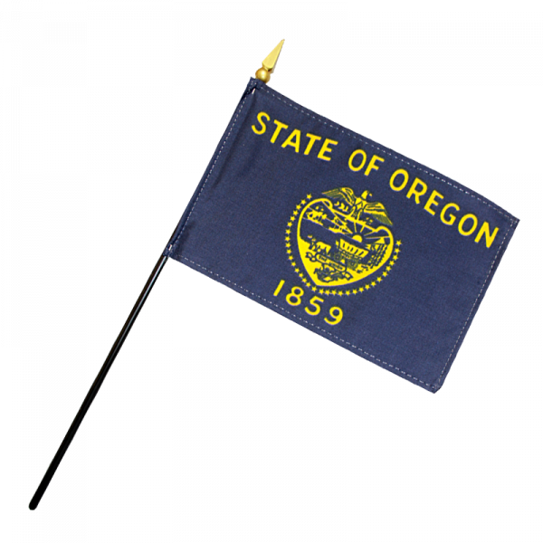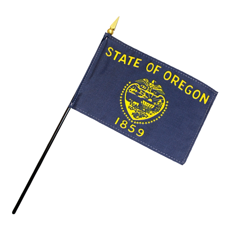 The flag of Oregon has a blue background. On the front is the escutcheon from the state seal. Above the seal is “State Of Oregon”, and “1859” below.