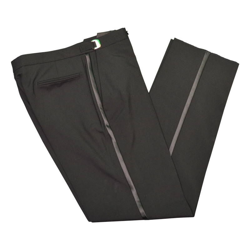 Plain front tuxedo trousers are made of 100% wool with satin leg braid. Two front pockets, two back pockets.