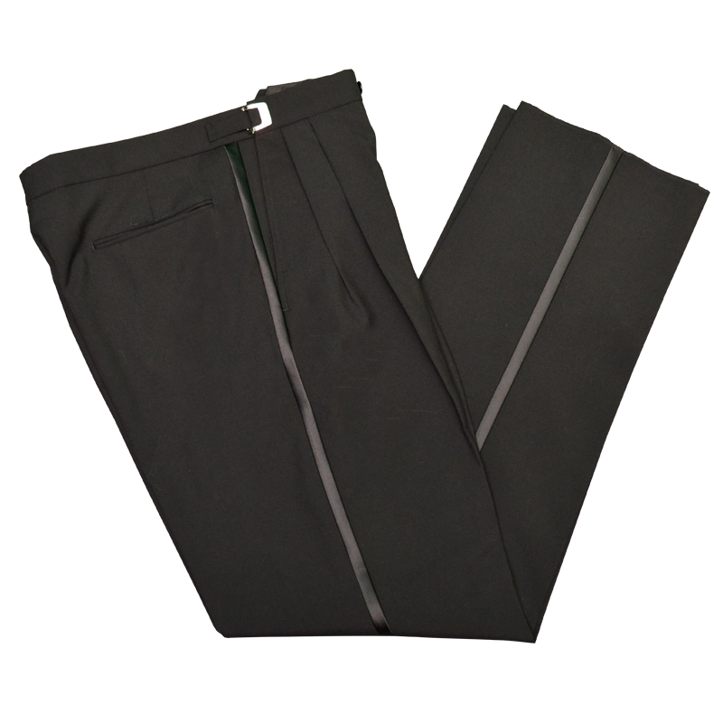 Pleated tuxedo trousers are made of 100% wool with satin leg braid. Two front pockets, two back pockets.