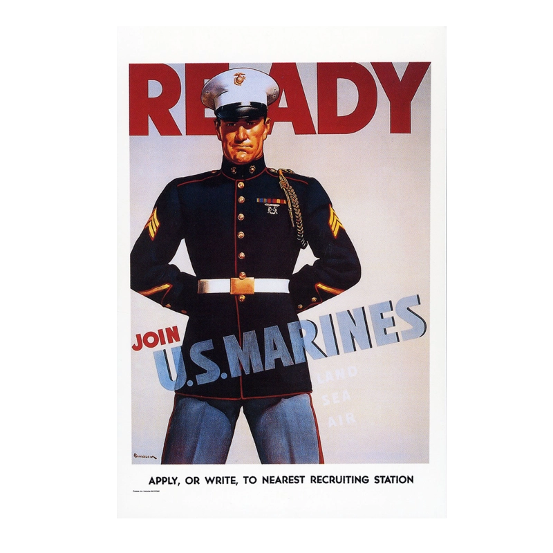 Postcard uses historical USMC “ready – Join U.S. Marines” recruiting poster on front. Approximately 4″ x 6″.