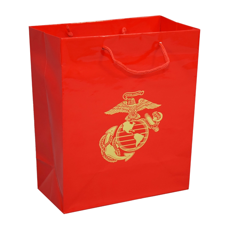 We’ve made gift giving easier for you! Red gift bag with rope handles has gold Eagle, Globe & Anchor on the front. Side and bottom gussets with cardboard bottom make this a sturdy tote that can accommodate taller gifts.