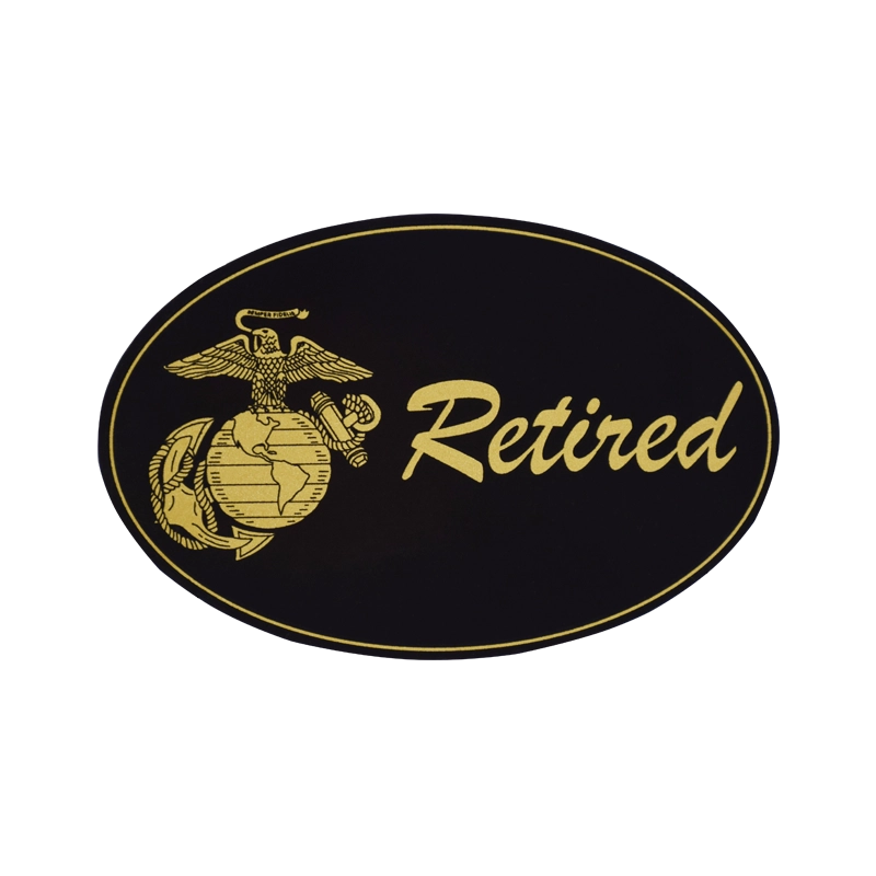 Black oval magnet features the Eagle, Globe & Anchor and “Retired” in gold.