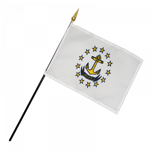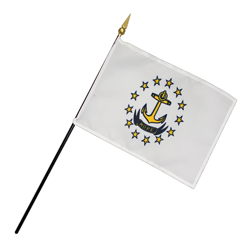 The flag of Rhode Island has a white background and consists of a gold anchor in the center surrounded by thirteen gold stars. A blue ribbon below the anchor bears the state’s motto in gold: “HOPE”.