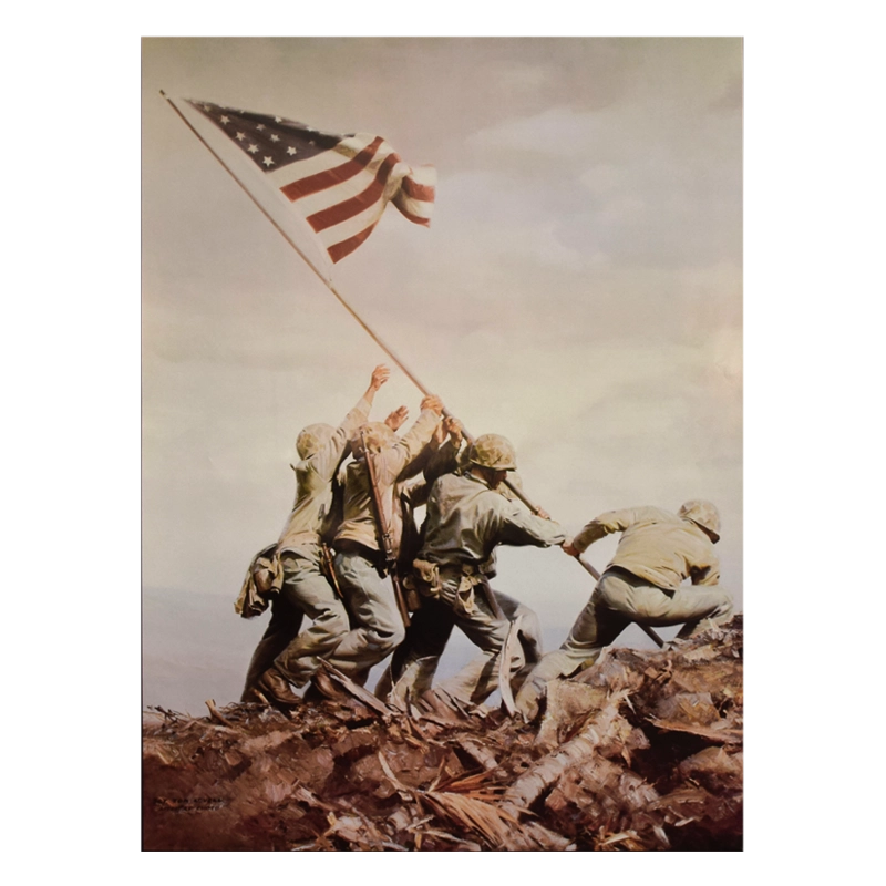 The photo that became the icon for United States Marine Corps. Joe Rosenthal’s photograph of the Iwo Jima flag raising is reproduced in this color poster.