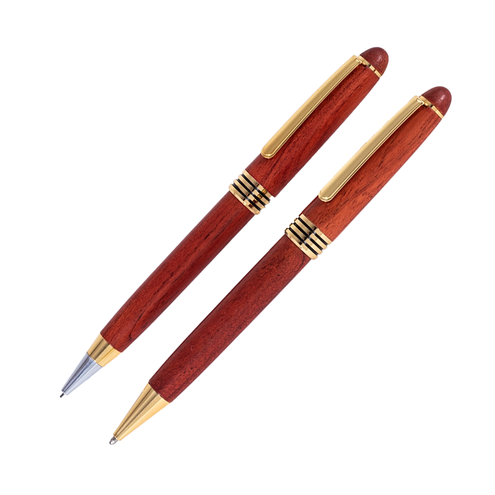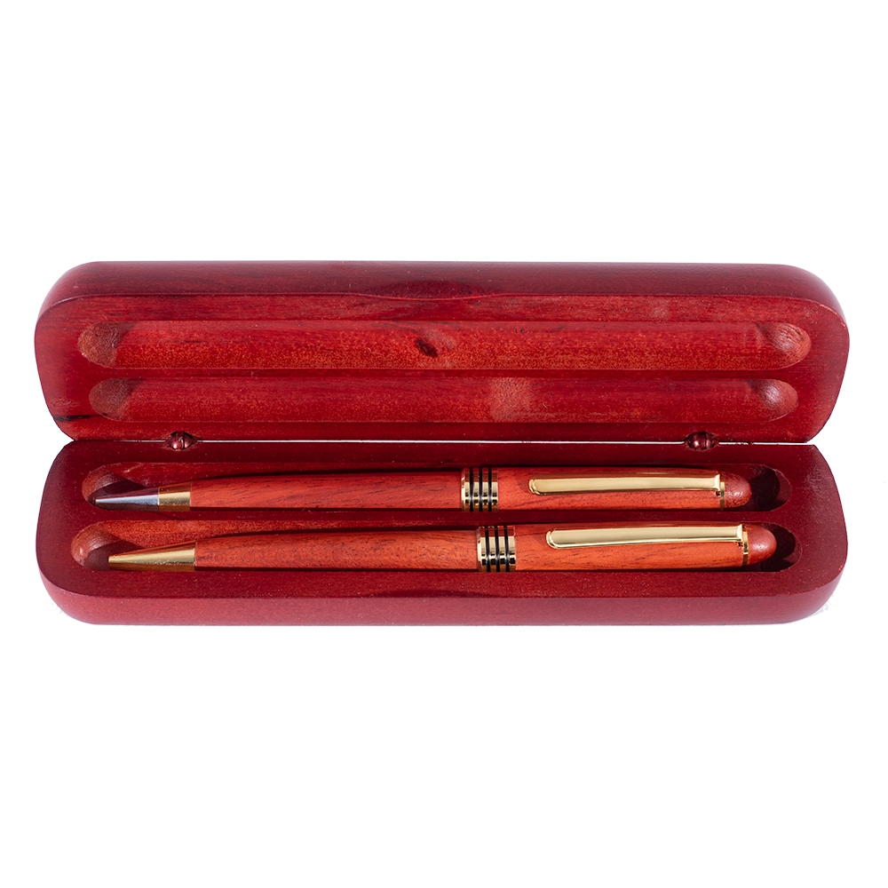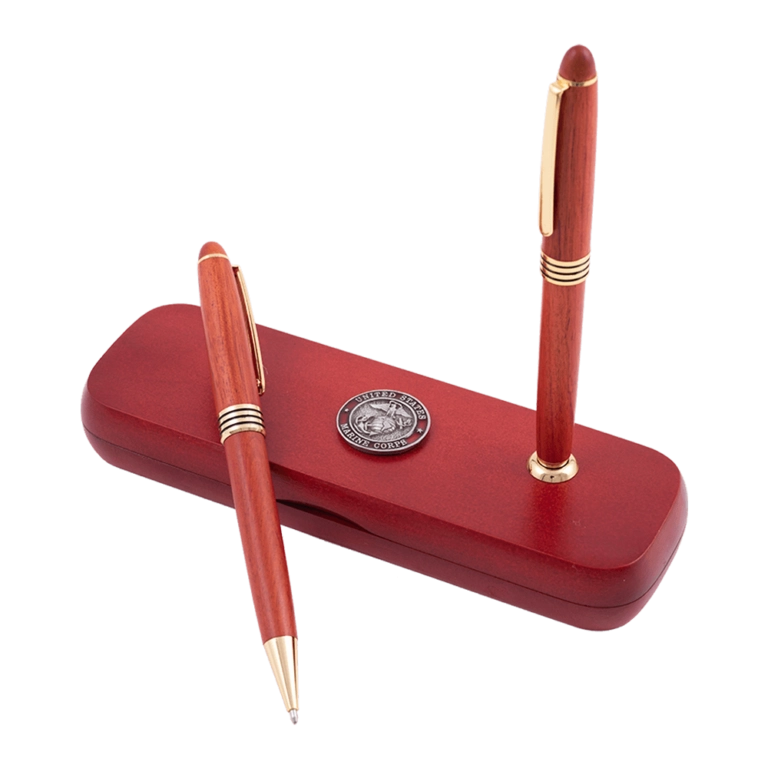 Rosewood pen & pencil set is made completely of wood with gold-plated accents. The case has a hand-crafted genuine pewter USMC emblem on the top. Rosewood case does double duty – when closed, it can be used as a pen stand.