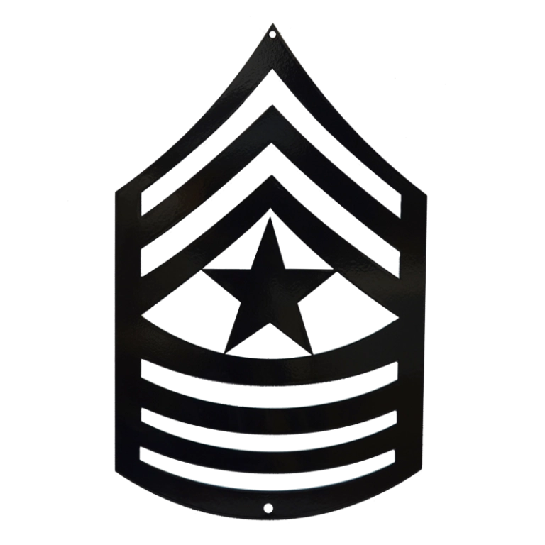 Sergeant Major rank insignia chevron is made from heavy 14 Gauge Steel in Black. Created using PhotoSTEEL™ – an environmentally-friendly, U.S. patented process that permanently bonds high resolution color graphics to a custom shaped metal sign.