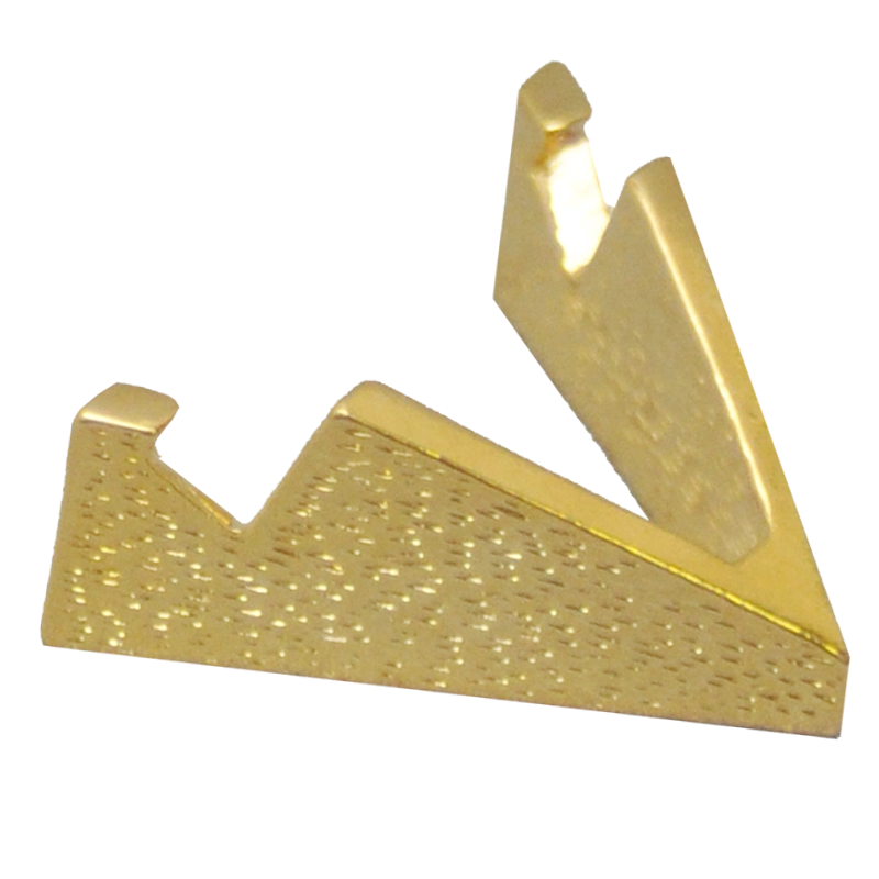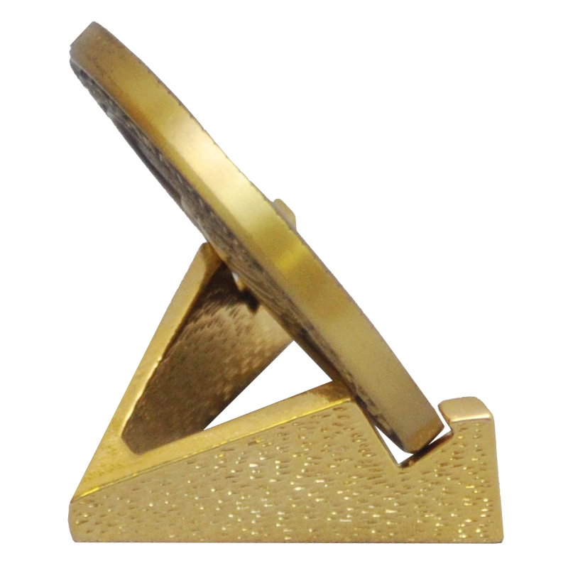 Coin stand in shiny, textured gold metal finish easily accommodates large Challenge Coins. V-shaped easel measures 1 1/2″ across front span.