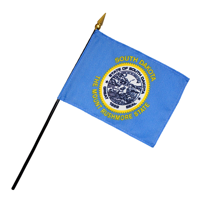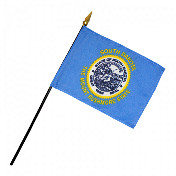 The flag of South Dakota has a sky blue background with a version (in navy blue on white) of the state seal in the center, surrounded by gold triangles, surrounded in turn by inscriptions in gold of “South Dakota” on top and “The Mount Rushmore State” on the bottom.