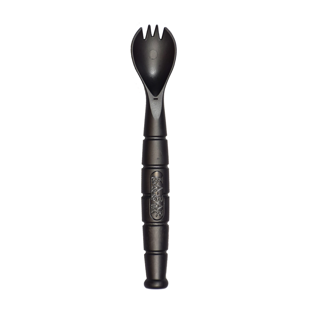 Ka-Bar® Tactical Spork, which is made from food and water approved Grilamid, is equipped with a fork/spoon combo and has a serrated knife hidden in the handle. The knife is accessed by pulling the spork in opposite directions from each extreme end.