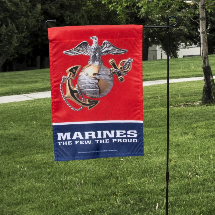 Red garden flag has Eagle, Globe & Anchor in rich detail and colors against bold red background. Underneath the graphic is “Marines – The Few The Proud” in bold white letters against dark blue background. This garden flag is soft to the touch and perfect for your garden bed, at the end of your driveway, or by your mailbox.