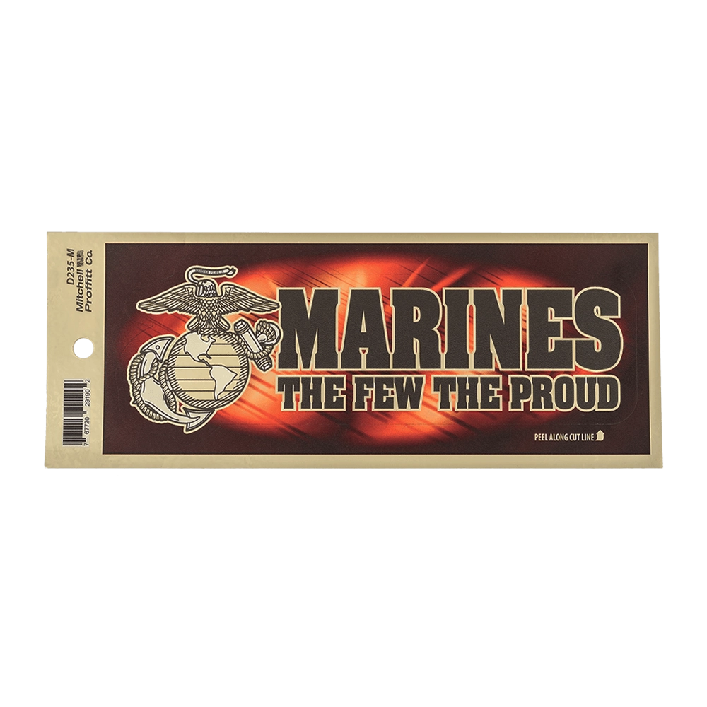 Gold-look bumper sticker has Eagle, Globe & Anchor with the famous motto “Marines – The Few. The Proud” against red and black background.