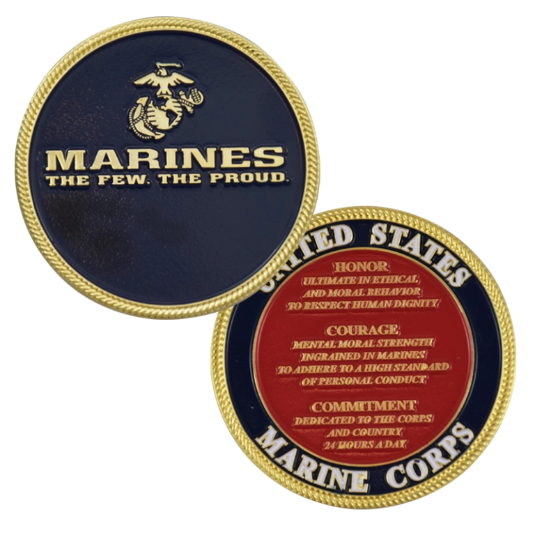 - REVERSE: Marine Corps Values – Honor, Courage, Commitment – with descriptions of each characteristic in gold against red background