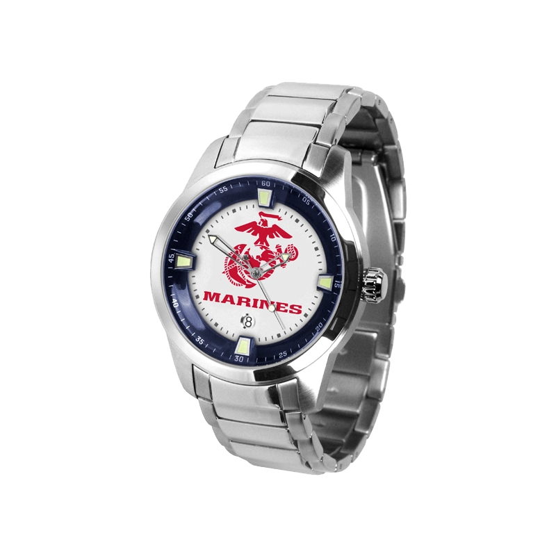 Men’s Titan Steel Watch by Suntime® features quartz accurate movement, stainless steel band and the Eagle, Globe & Anchor in red against a white watch face. The stylish design and exceptional quality adds this bold favorite.