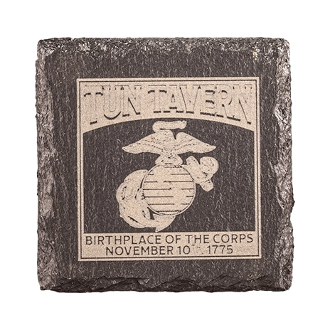- Slate coaster set, engraved with Tun Tavern Birthplace of the Corps text and eagle, globe and anchor logo