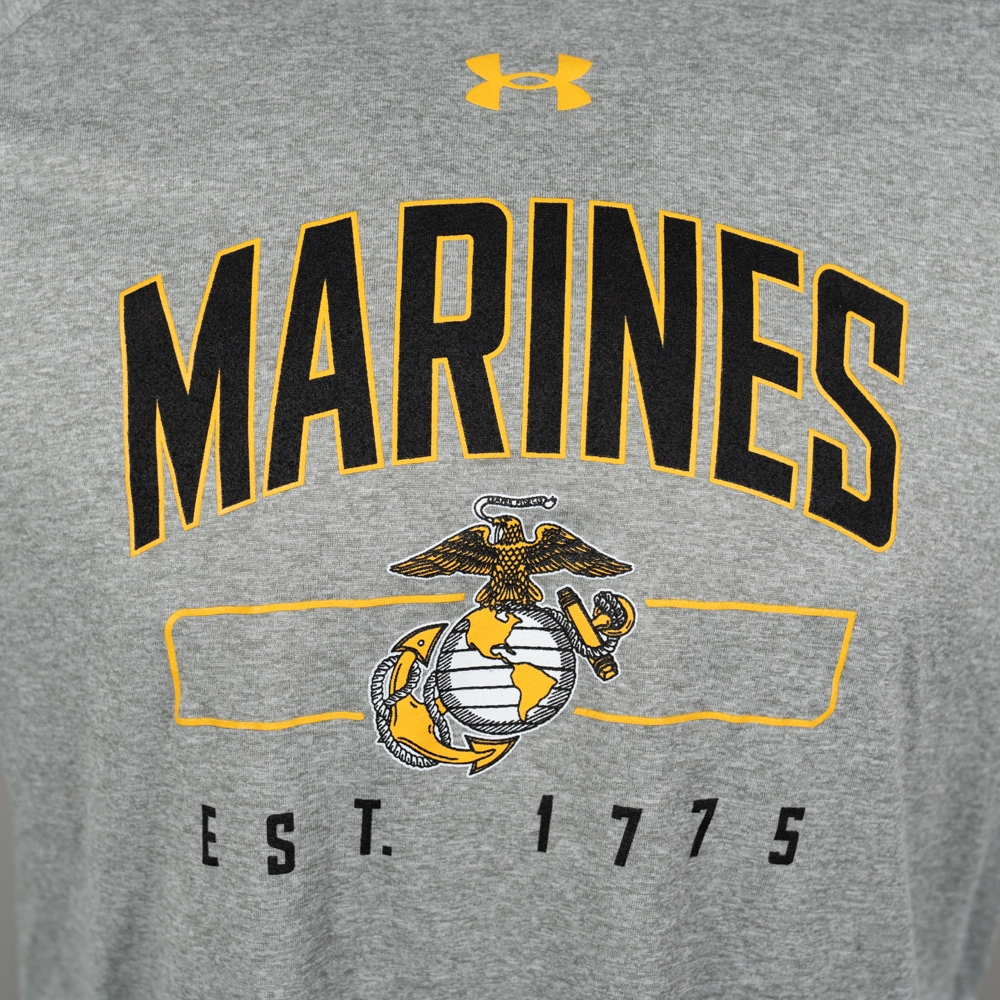 The UA Tech Short Sleeve Tee in Heather Grey is more than just a t-shirt; it’s a powerful expression of your patriotism and unwavering support for the United States and its heroes. This shirt features the word “Marines” prominently printed across the front in bold letters and the Eagle, Globe and Anchor, encapsulating the honor, courage, and commitment that the Marine Corps represents.