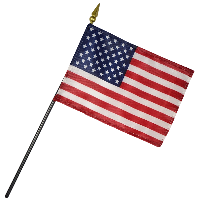 Mini United States of America flag with staff. This is the perfect size for waving during a parade, lining your walkway for parties, or adding to table centerpieces for patriotic flair.