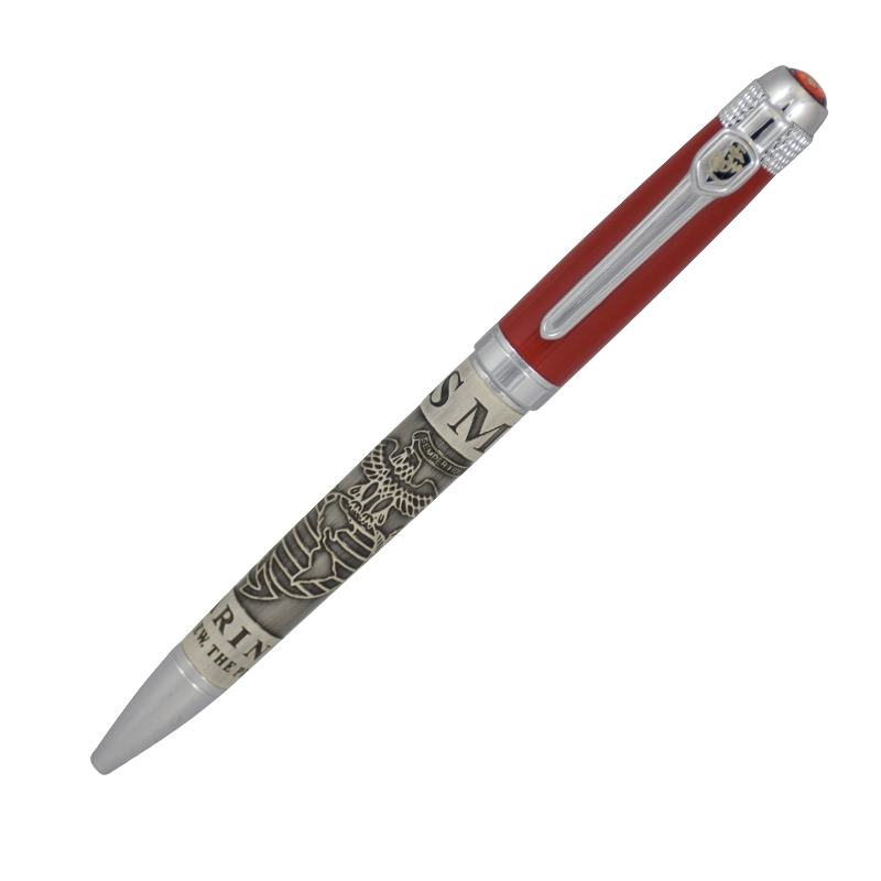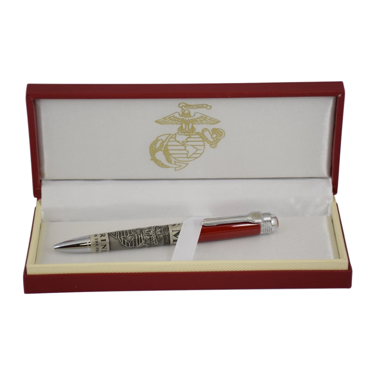 Gift boxed stainless steel and pewter ball point pen has tons of detail. The top of the pen is red with a full color Marine Corp emblem end cap. Main body of the pen barrel features the Eagle, Globe & Anchor etched into steel body, along with “USMC” and “The Few. The Proud.” The silver clip has gold Eagle, Globe & Anchor detail, with matching textured silver accent coupler rings to finish the detailed look. Black ink included.