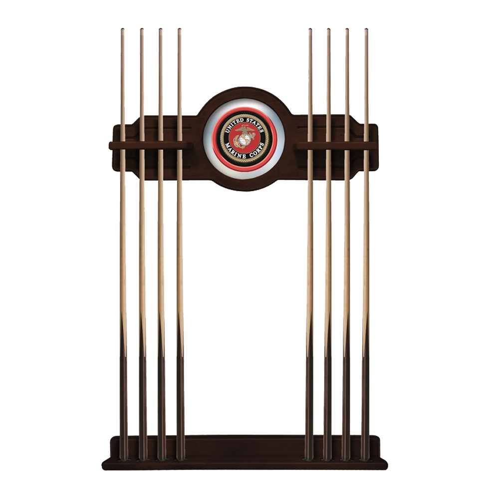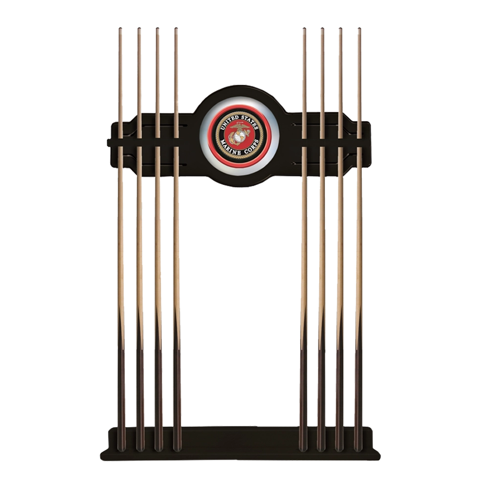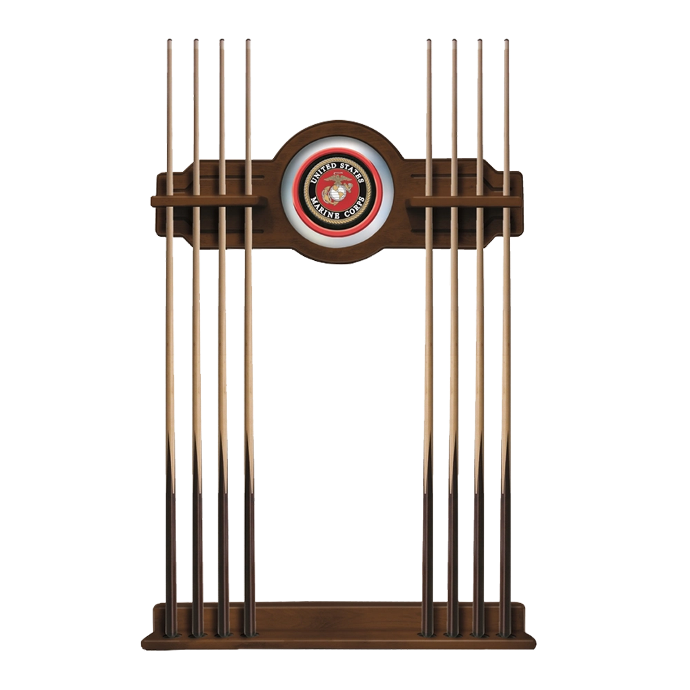 U.S. Marines Cue Rack by Holland Bar Stool Co. is available in Black, Chardonnay, English Tudor, or Navajo finish. This officially licensed USMC 2-piece Cue Rack is a must have accessory for your pool table. Furniture quality cue rack is made of solid wood – no particle board or veneer like other products on the market. The top section features CNC routed decorative elements and a 10 1/2″ real mirrored glass center piece that features a first surface digitally UV printed USMC emblem in full color, not a sticker like other cue racks. The “shelves” have routed holes that hold the stick in place and won’t damage the cue shaft like inexpensive plastic clips. The bottom section has designated felt-lined areas for cue bumpers to sit in.