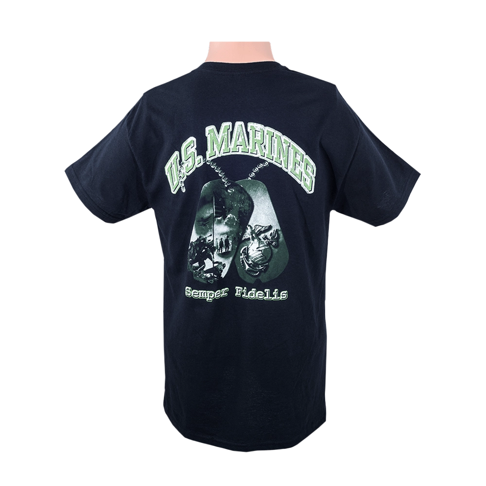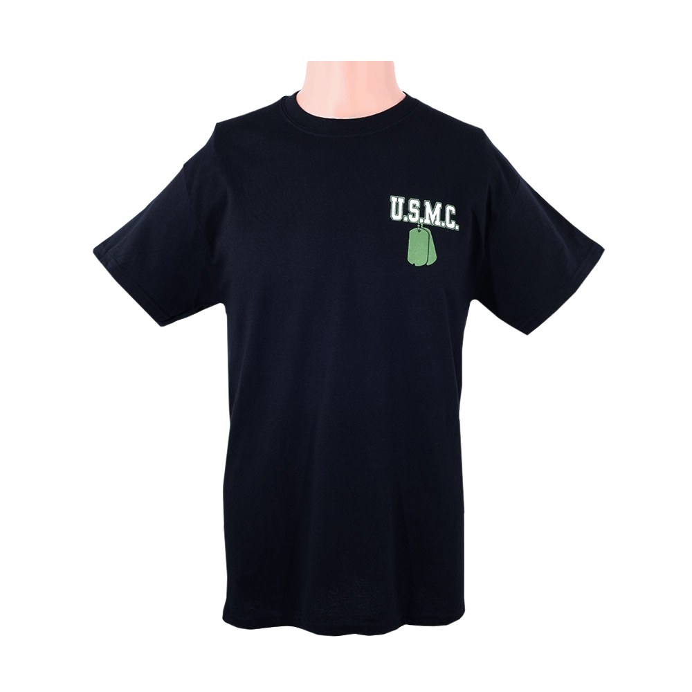 The front of the shirt showcases a pair of dog tags, an iconic symbol associated with military service. The dog tags are intricately detailed and display the U.S. Marine’s emblem, providing a sense of pride and identity.