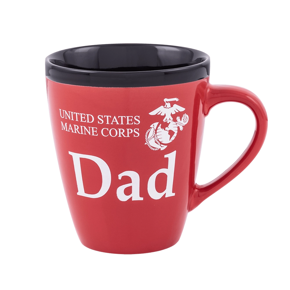 Red mug with black interior and trim has “United States Marine Corps” with Eagle, Globe & Anchor near the rim. “Dad” screened in large white script below. Design on both sides of the mug.