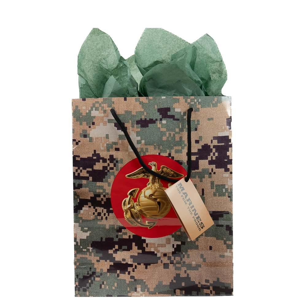 Present your Marine with gifts in this fun and unique gift bag. It comes in the Marines Digi-Camo print and is decorated with the USMC seal on one side and a gold EGA on the other side and black robe handles.