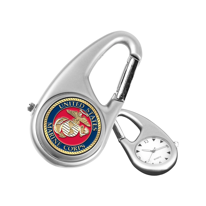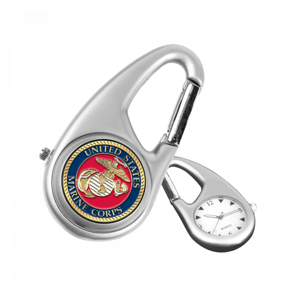 This battery-operated time piece features a satin nickel carabiner case that clips to your golf or gear bag with remote face orientation. Full color USMC emblem marker mounted permanently into the battery case.