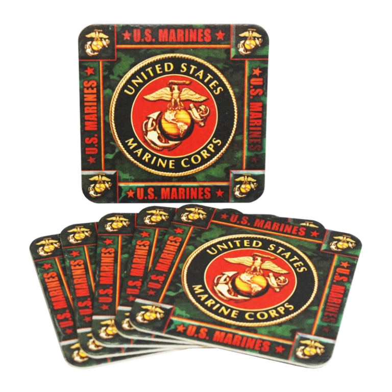 Serve drinks to your guests drinks using these USMC emblem coasters. Design includes bold graphic of USMC emblem against digital camo background. Perfect for any party or social occasion. These coasters would also be a nice addition to your Marine ball or reunion.