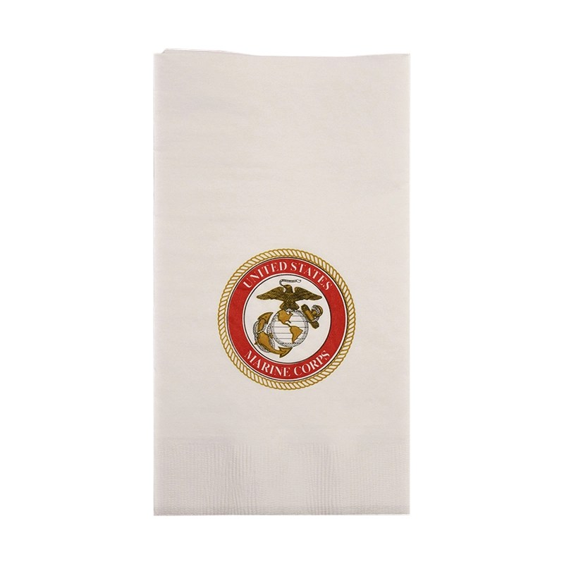 White dinner napkin with red and gold USMC emblem.