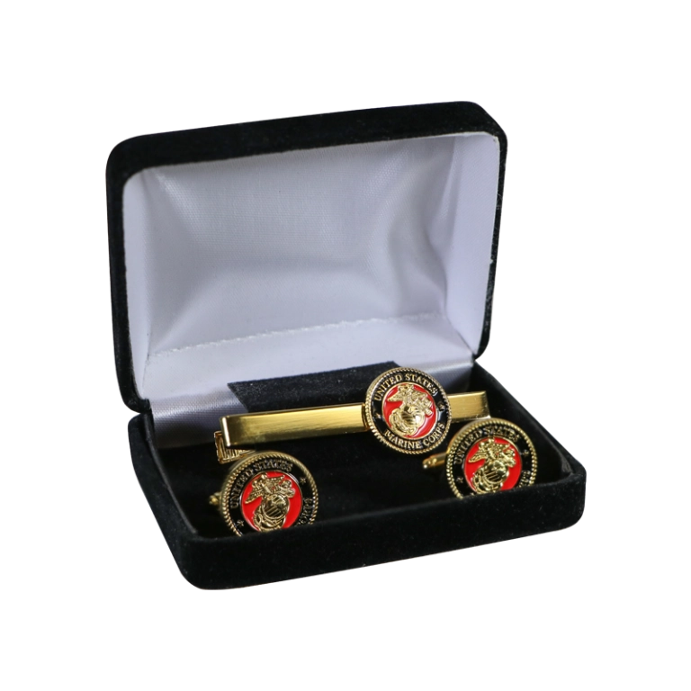 Gold tie bar and cufflinks with full color USMC emblem will complement any civilian suit ensemble. USMC emblem is made of soft enamel with bright colors.