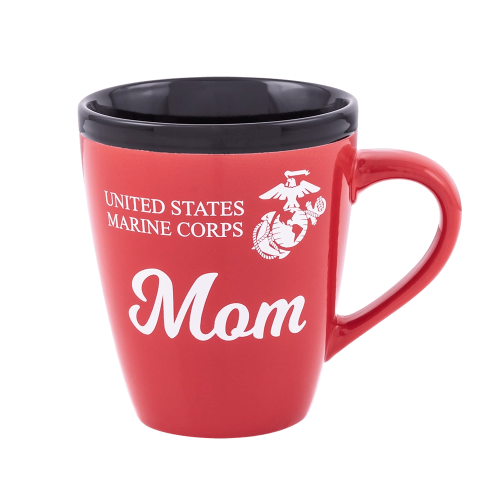 Red mug with black interior and trim has “United States Marine Corps” with Eagle, Globe & Anchor near the rim. “Mom” screened in large white script below. Design on both sides of the mug.