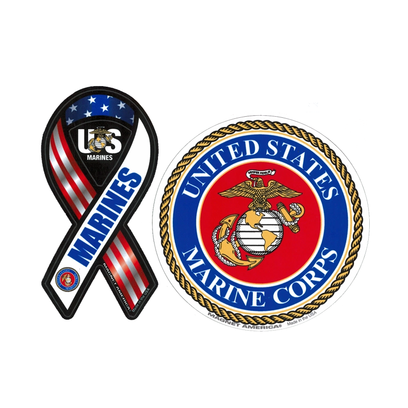 Show your Marine pride on your ride with this magnet combination set. Includes: full color USMC emblem, Marines ribbon magnet and US Marines with Eagle, Globe & Anchor magnet.