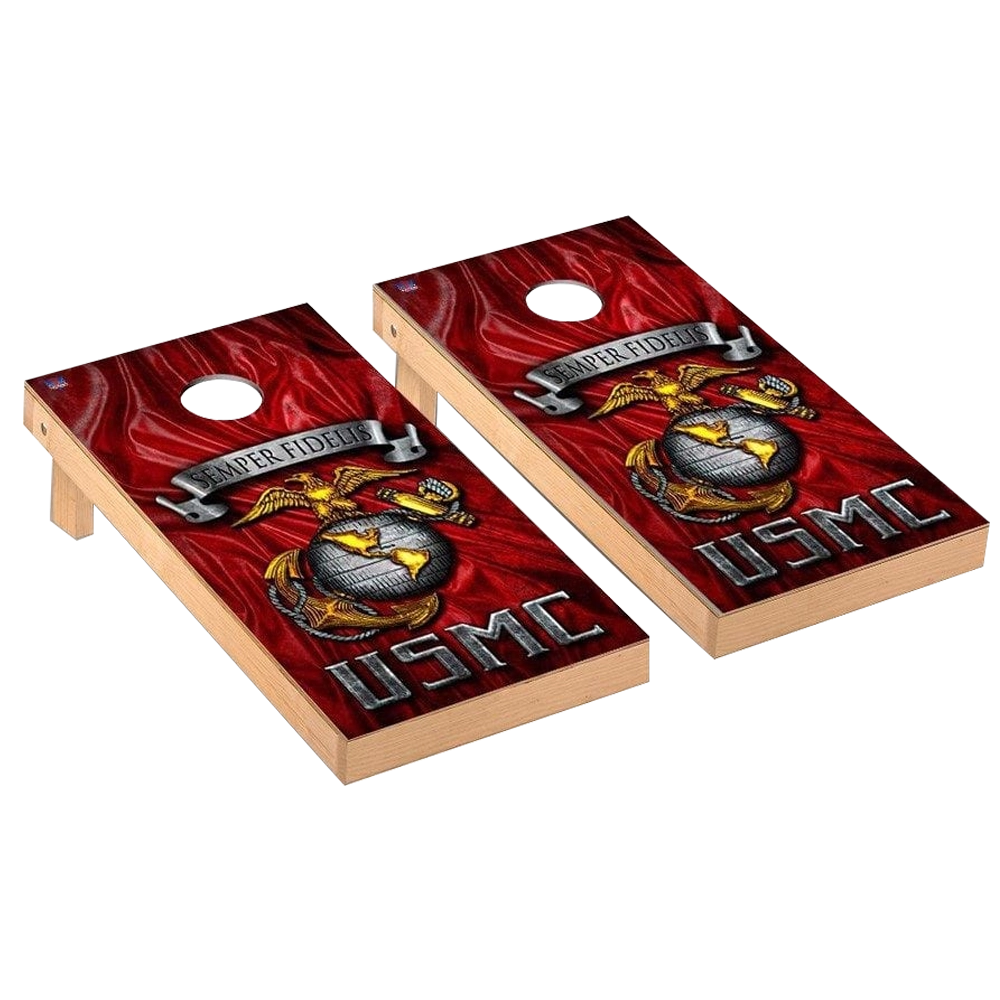 Add some fun to your next picnic, tailgate party, or other outdoor event. High-quality cornhole game set has boards decorated with large Eagle, Globe & Anchor against a draped red background. Silver banner below hole has “Semper Fidelis.” Underneath the Eagle, Globe & Anchor is “USMC” in large block letters.