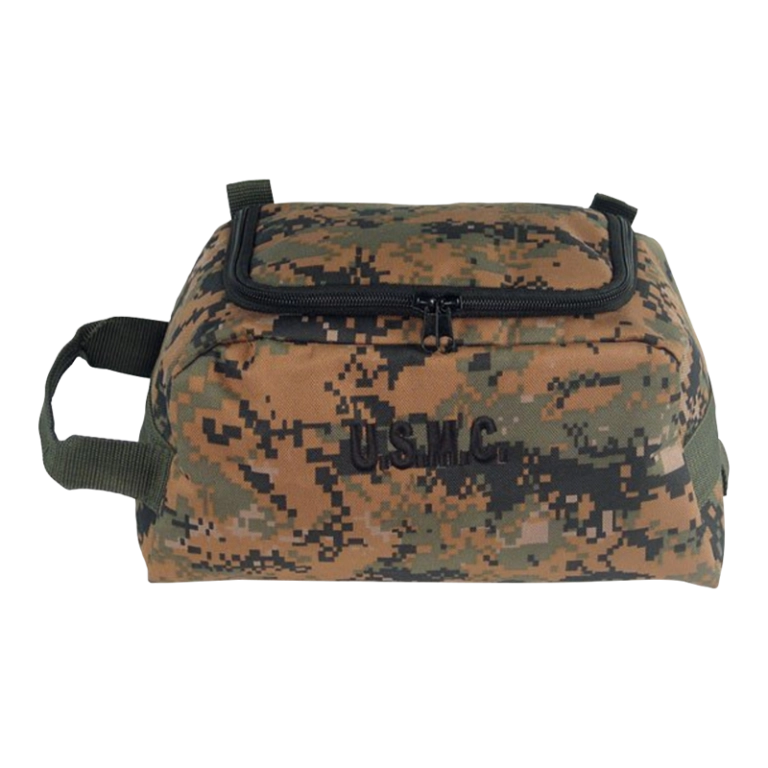 Shave kit in woodland camouflage zips open from the top. “USMC” embroidered in black 3D stitching on the front. Black webbed carrying strap.