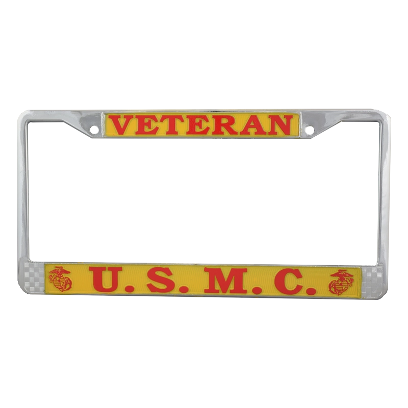 License plate frame made of polished chrome with “Veteran – U.S.M.C.” in red letters on yellow background. Eagle, Globe & Anchors, on lower frame point inward.