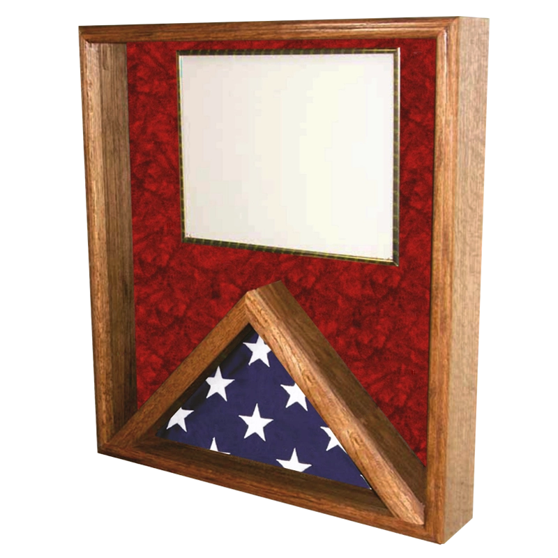 Walnut Flag Case and Certificate Frame is made of solid walnut with crushed red velvet backing for a dramatic backdrop. Combination case includes space to display an 8 1/2″ x 11″ certificate and a folded 3′ x 5′ flag. Glass front.