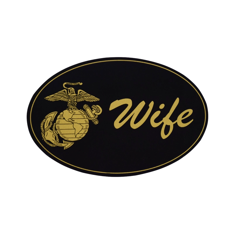 Black oval magnet features the Eagle, Globe & Anchor and “Wife” in gold. Magnet measures 5.75″ at widest point.