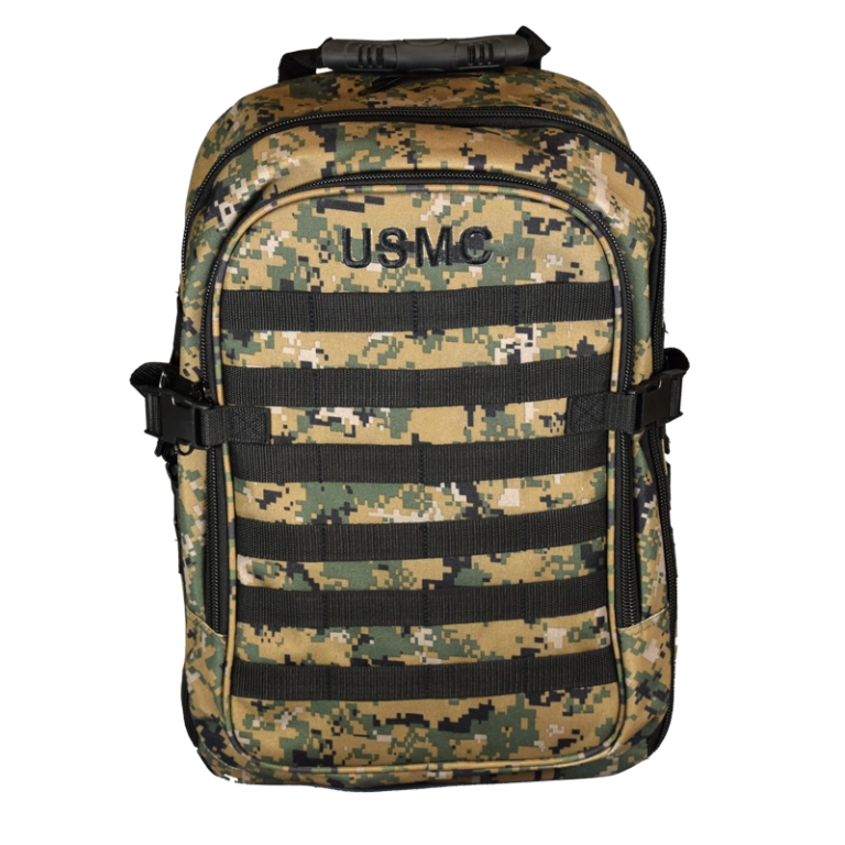 MOLLE Backpack in digital woodland camo is great for personal use. Separate compartments, interior pockets, and top carrying handle makes this backpack useful as a carry-on when travelling. “USMC” embroidered in black at top front.
