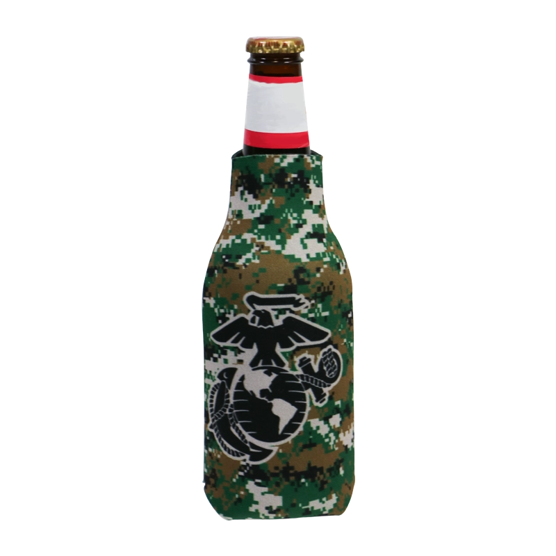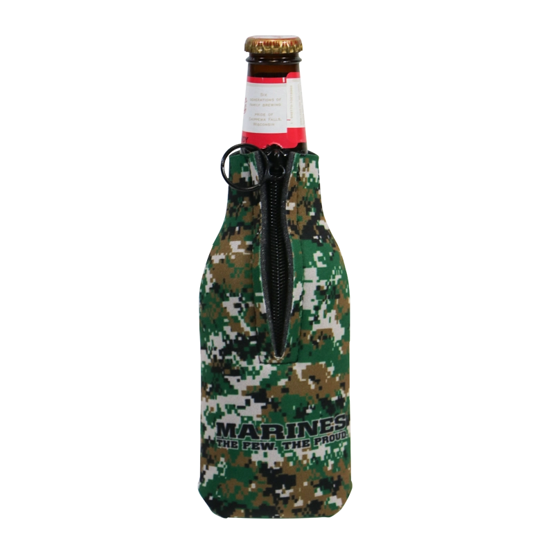 Collapsible bottle cooler in woodland digital camouflage has black Eagle, Globe & Anchor with tan outline on the front. Back has “Marines – The Few The Proud” in black with tan outline near bottom edge. Matching black zipper to ensure a snug fit to keep keep your drink cool.